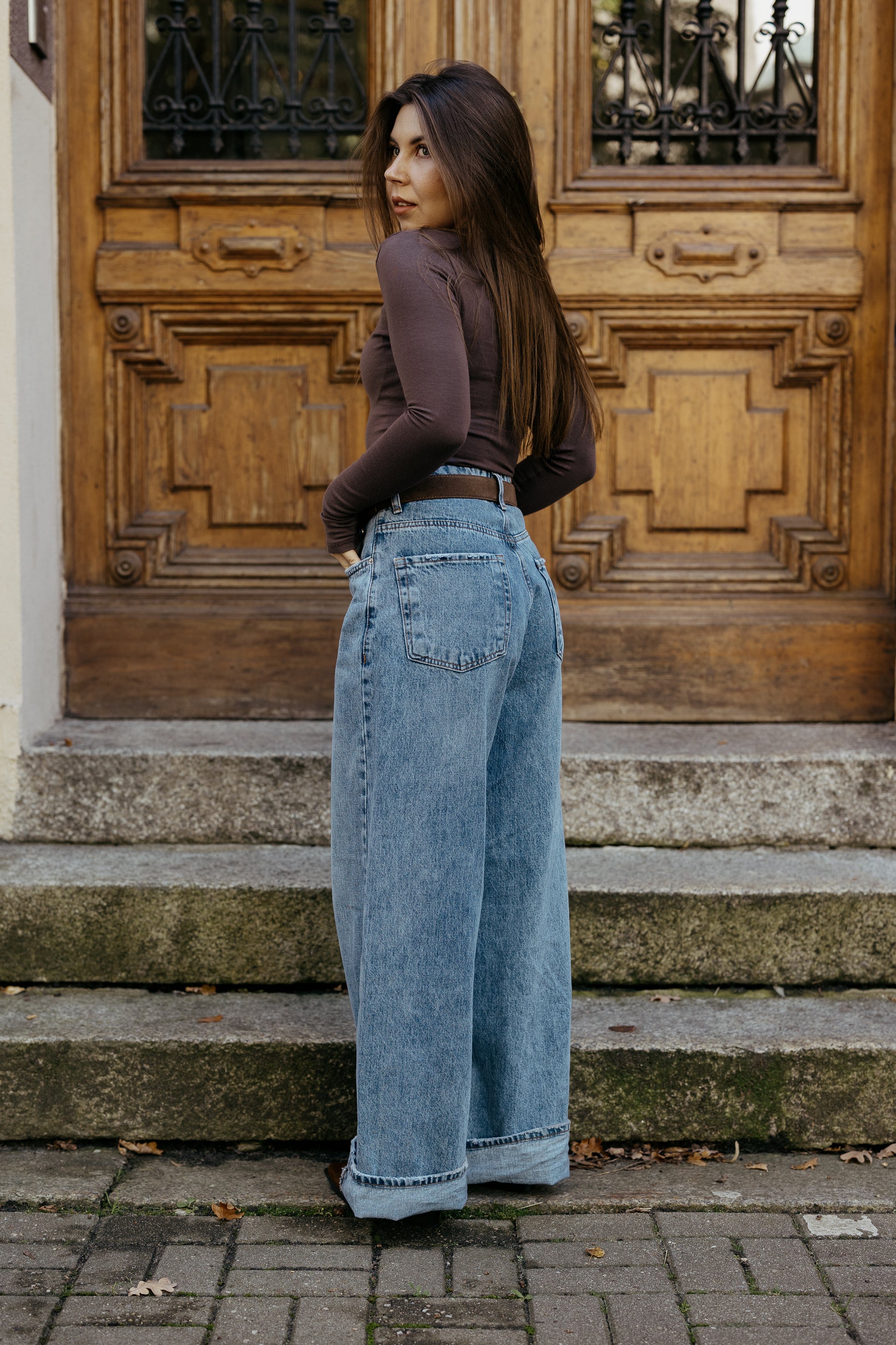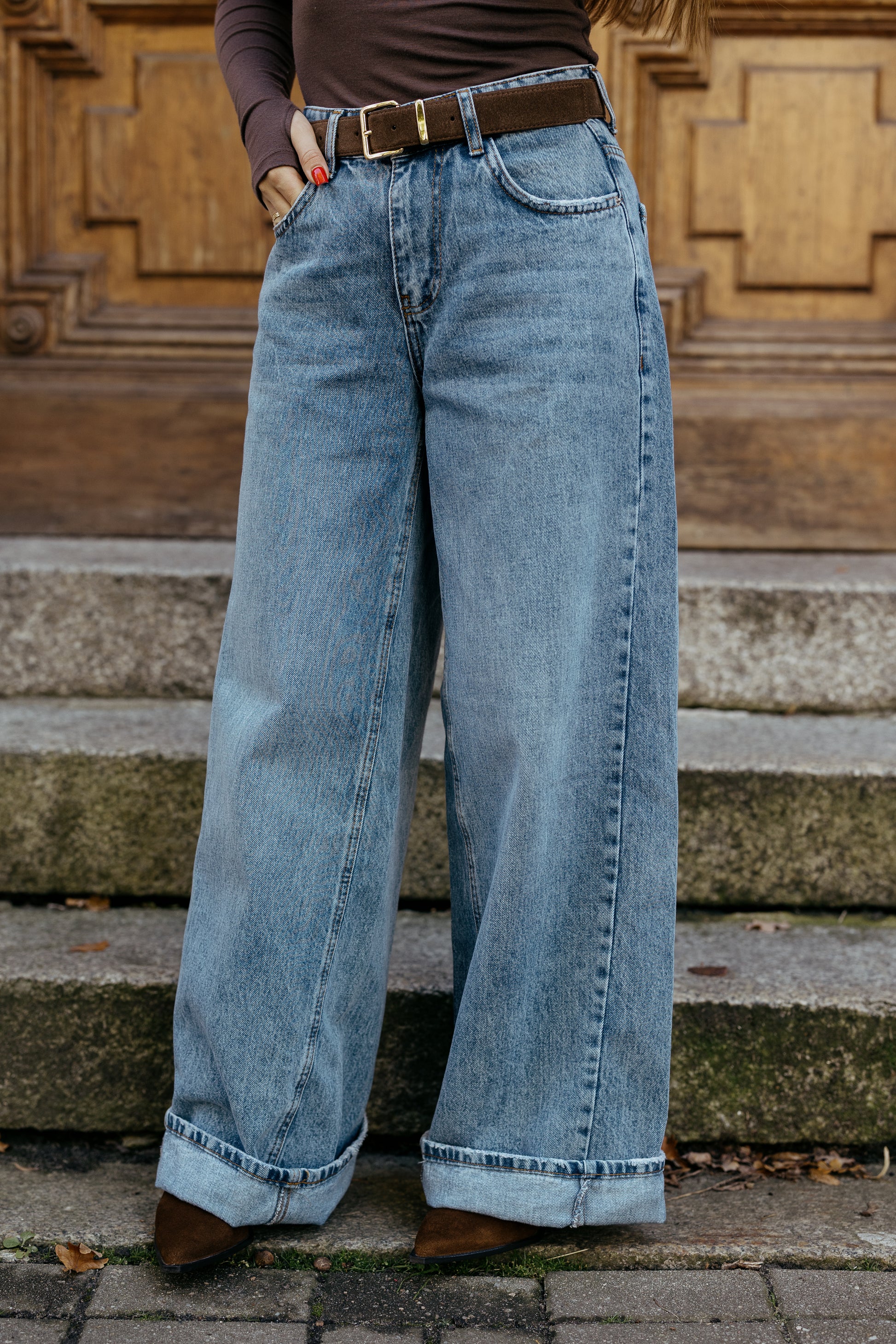 Stylowe jeansy o luźnym, szerokim kroju to absolutny must-have w szafie każdej miłośniczki mody. Wykonane z wysokiej jakości denimu, zapewniają komfort noszenia i swobodę ruchów. Klasyczny niebieski odcień jeansu sprawia, że łatwo dopasujesz je zarówno do casualowych stylizacji, jak i bardziej eleganckich zestawów.